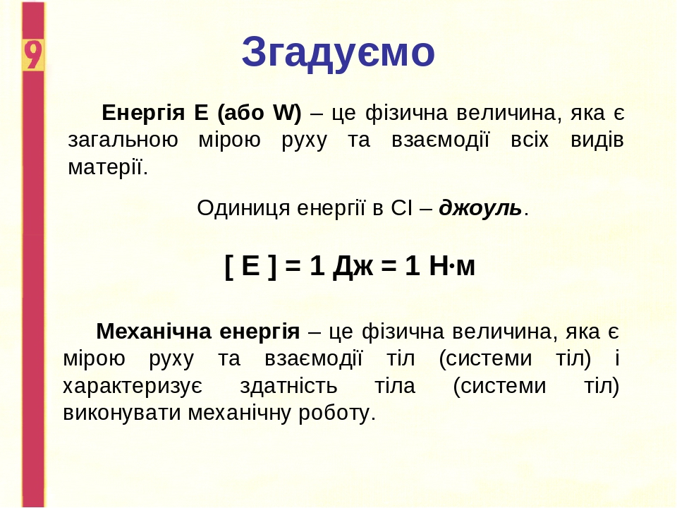 Д/з Опрацювати § 40, дати письмову відповідь на контрольні запитання після параграфу, задача: М'яч масою 800 г кинули вертикально вгору. Чому дорівнює кінетична і потенціальна енергія м'яча на висоті 10 м, якщо кінетична енергія м'яча в момент кидання дорівнює 100 Дж?
